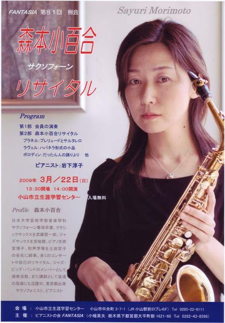 3月22日の例会は第2部で森本小百合サクソフオーン・リサイタルを行います。 第1部は会員の皆さんの演奏です。当日はコンサートとして一般客の他にケーブルTVなどのマスコミも入る予定ですので、緊張感のあるステージになります。 http://hob.web-service.jp/psmorimoto090322.htm