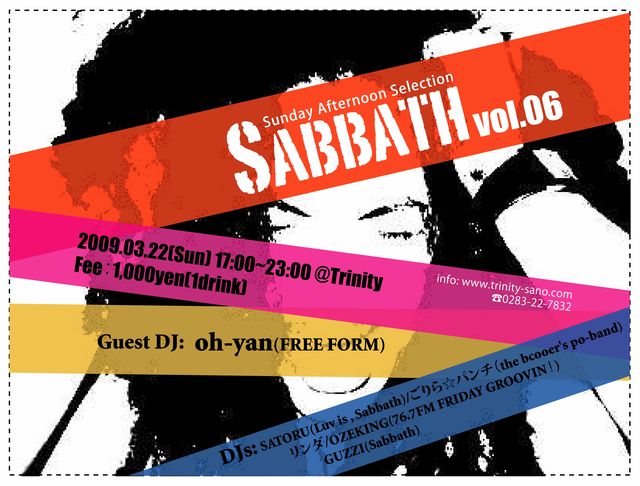 Sunday Afternoon Selection Sabbath vol.06 2009.03.22(Sun) 17:00~23:00 @Trinity Fee:1,000yen(1drink) ※19:00までにお越しいただいたお客様に限り、1,000yen(2drink) Guest DJ: oh-yan(FREE FORM) DJ: SATORU(Luv is , Sabbath) ごりら☆パンチ(the bcooer's po-band) リンダ OZEKING(76.7FM FRIDAY GROOVIN!) GUZZI(Sabbath) Trinity 327-0846 佐野市若松町138 0283-22-7832 http://www.trinity-sano.com/ http://mixi.jp/view_community.pl?id=2427126 地図↓ http://maps.google.co.jp/maps?f=q&