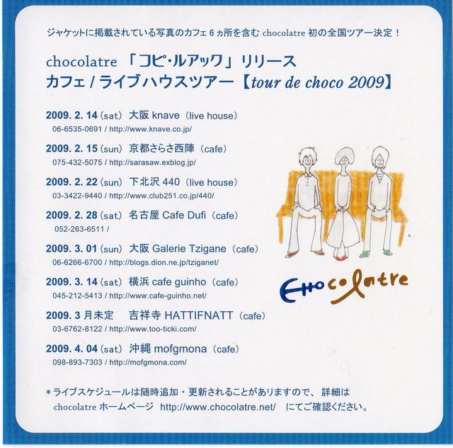 みなさんこんにちは 今月3月22日(日曜日) 「chocolatre」LIVEを開催します。 「chocolatre」ショコラトルと読みますよ http://www.chocolatre.net http://myspace.com/chocolatre LIVE予定時間 14:00〜14:30 16:00〜16:30 を予定してます(多少時間が前後する場合はご了承下さい) MUSIC FEEは最低1DRINKオーダーさせていただきます 【chocolatre profile】 ◆あず (ボーカル/ キーボード) 04.14生まれ 愛知県出身 favorite/フランス・北欧雑貨