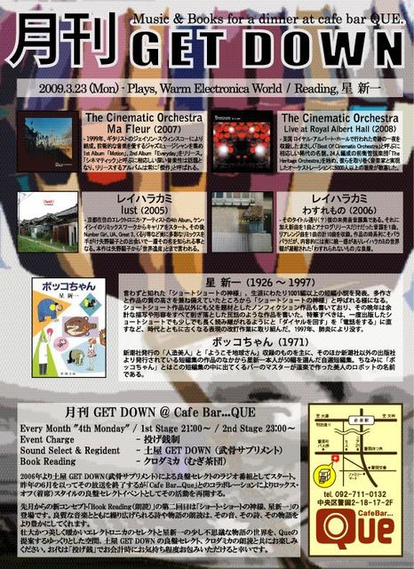 今月も告知させていただきます♪ 3/23(mon) @ café bar…QUE 「月刊 GET DOWN Plays, Warm Electronica World / Reading, 星新一」 1st Stage 21:00〜 / 2nd Stage 23:00〜 Music Charge - 投げ銭制 Sounds Select & Regident - 土屋 GET DOWN (武骨サプリメント) Book Reading - クロダミカ (むぎ茶団) Cafe Bar...QUE - 092-711-0132 / 福岡市中央区警固2丁目18-17 2F Queコミュ・・・http://mixi.jp/view_community.pl?id=2325075 □月刊 GET DOWN とは 2006年より土屋 GET DOWN(武骨サプリメント)に