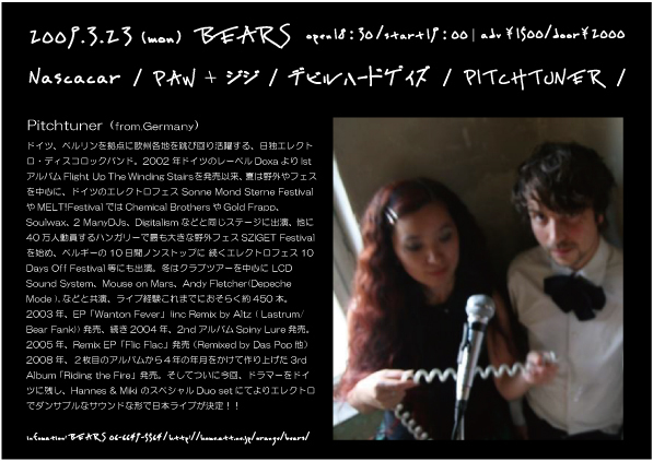 Pitchtuner>> ドイツ、ベルリンを拠点に欧州各地を跳び回り活躍する日独エレクトロ・ディスコロックバンド。2002年ドイツのレーベルDoxaよりIstアルバムFlight Up The Winding Stairsを発売以来、夏は野外やフェスを中心に、ドイツのエレクトロフェス Sonne Mond Sterne FestivalやMELT!FestivalではChemi