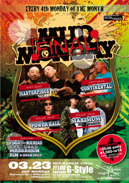 YAH MAN! 色々な方の協力を頂き、2年ちょっとKEEPして来た "MUD MONDAY"が、 諸事情により、今回で終わります。 最後のMUDは東京&埼玉のブレジンSOUNDの、 MASTERPIECE SOUND & CONTINENTALをGUESTに迎えて、 "ワッショイワッショイ有終の美のお祭り"なPARTYです!! 全国の箱でも中々、縦積みが出来ないMAXIMUM SOUND SYSTEM "HIGH GRADE DEALERが県内で唯一の縦積み出来る箱(G-Style)でもあります! MUDに毎回来てくれてる方はもちろん、 たまにしか来れない方、興味はあるけどまだ来れて無い方は、 是非ゼヒ!最後のMUDを体感