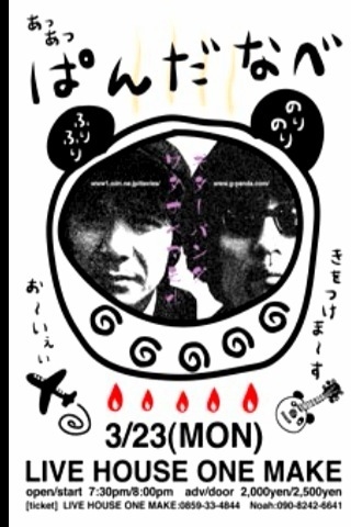 『あつあつ ぱんだなべ』はいかがですか? ☆ギターパンダ(山川のりお) www.g-panda.com/ ☆ワタナベマモル(元グレートリッチーズ) www1.odn.ne.jp/davies/ 豪華2本立てライブです! 精力的にツアーをこなす2人が、偶然にもこの米子で久しぶりの競演が実現しましたぁ! しかも、\2,000でこの2人のライブが観れるなんてぇ〜っ!あり得ません! ハッピーで、ファニーで、ちょっとせつない2人のライブで、ハッピーな春を呼び込みましょ〜! ★2009年3月23日(月曜日) ★Live house ONE MAKE 0859334844 ★open/start 7:30pm/8:00pm〜 ★adv/doo