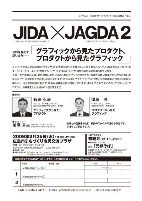「JAGDA」広島地区代表の川原さんから 有益なイベントの情報が入りましたので こちらでも告知させていただきます! ---------------------- マツダ関係、カーデザイナー、ミカサ、JMS等 出席されます。 双方に利益があると思われますので 新たな交流の場としてご参加下さい。 イベント自体の参加費は無料です。 懇親会に行きたい方は 21:00〜4,000円です。 ------------------------------------------------------------------- ★★★3月25日(水)JAGDA×JIDA合同イベント第2回 19:00〜21:00 場所/広