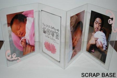 管理人さま、貴重なスペースお借りします、不適切であれば削除願います。 はじめまして 尼崎市在住、スクラップブッキング・メモラビリアート認定講師の、 「たいる」と申します 3月より、武庫之荘駅近郊にて、 スクラップブッキングの教室を開講することになりましたので ご案内させていただきます。 お子様連れOK お友達とご一緒に…もちろんOK 今回は、アクリル板を使った“写真立て風”の作品です 立てて飾っていただいても良いですし、リボンで結んで誰かにプレゼ