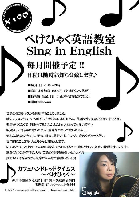 灘区水道筋のカフェハンドレッドタイムス〜ぺけひゃく〜という 灘中央筋商店街にあるカフェ&ライブ喫茶にて ナコミ先生の英語の歌の発音教室があります。 毎月一回のレッスンです。 そんなに堅苦しくなく ビールでも飲みながら参加者でワイワイ気軽に英語の歌を 歌いながら正しく発音しましょう♪という教室です。 お気軽に参加してみませんか? 毎回美味しいおつまみをパクつきながらワイワイやってます♪ Singlish〜ぺけひゃく英語教室〜 ■日時:3月26日(木) ■20時〜21時 ■費用は参加費 1