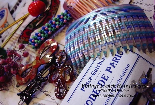 管理人様、失礼致します。 3月26日(木)より、神戸・トアウエストにあるJeJe店内奥ギャラリースペースにて、「Vintage French Hair Jewelry 〜1920's-1970's〜」を開催致します。 希少なベークライトのヘアスティックにセルロイドのヘアピン。 ポップなパステルカラーが可愛らしいプラスチックのヘアコーム。 1920年代〜1970年代のデッドストック(新品未使用)、一点モノのヘアジュエリーがこの度JeJeに集まります。 普段はなかなかお目に掛かれない希少なアイテムばかりです。 フレンチアンティーク好きの皆様に是非ご覧頂けたら