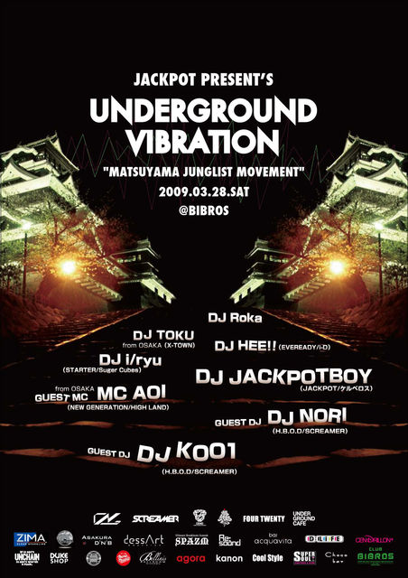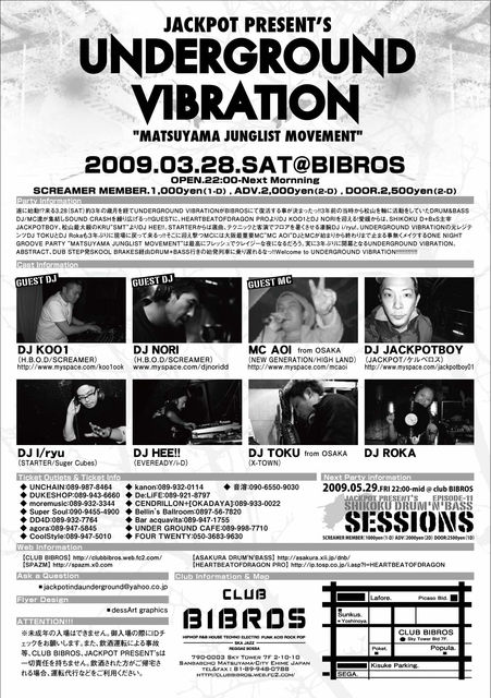 管理人様、告知させて頂きます。 ================================ JACKPOT PRESENT's UNDERGROUND VIBRATION "MATSUYAMA JUNGLIST MOVEMENT" OPEN22:00~NEXTMORNNING!!@BIBROS SCREAMER MENNBER>>1000YEN(1-D) ADV>>2000YEN(2-D) DOOR>>2500YEN(2-D) ================================ CAST INFOMATION GUEST DJ is... DJ KOO1(H.B.O.D/SCREAMER) http://www.myspace.com/koo1ook DJ NORI(H.B.O.D/SCREAMER) www.myspace.com/djnoridd GUEST MC is... MC AOI(NEW GENERATION/HIGH LAND)fromOSK http:/