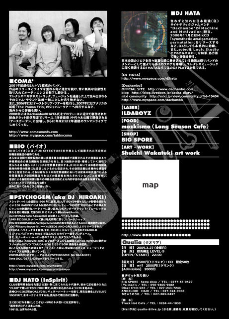 管理人様、告知失礼致します 『Qualia』=クオリア= 2009>3>27 群馬桐生LEVEL-5 OPEN/START 22:00 前売り 2500円(1ドリンク)+CD 限定50枚 当日 w/f2500円(1ドリンク) Admission 2800円 <LIVE> COMA* (群馬初) BIO <DJ> DJ HATA(from DACHAMBO) DJ HIROAKI (PSYCHOGEM/ene records) DJ HATO(InSpirit) <LASER> ILDABOYZ <FOOD> mozkismo(Long Season Cafe) <SHOP> BIG SPORE 2008渚音楽祭、earth garden、濱jam出演と今もっ