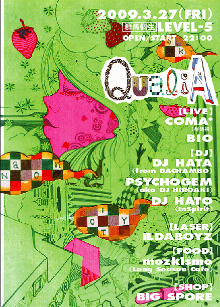 管理人様、告知失礼致します 『Qualia』 =クオリア= 2009>3>27 群馬桐生LEVEL-5 OPEN/START 22:00 前売り 2500円(1ドリンク)+CD 限定50枚 当日 w/f2500円(1ドリンク) Admission 2800円 <LIVE> COMA* (群馬初) BIO <DJ> DJ HATA(from DACHAMBO) DJ HIROAKI (PSYCHOGEM/ene records) DJ HATO(InSpirit) <LASER> ILDABOYZ <FOOD> mozkismo(Long Season Cafe) <SHOP> BIG SPORE 2008渚音楽祭、earth garden、濱jam出演と今も