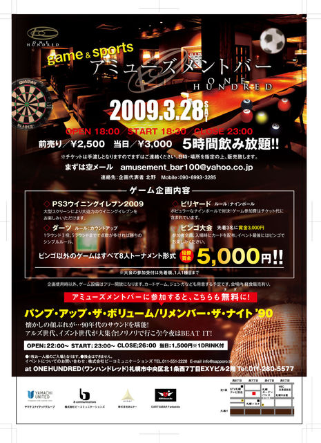 今回、“アミューズメントバー ONE HUNDRED”という、飲みながらビリヤード、ダーツ、ウイニングイレブン(サッカーゲーム)をプレイできるバーというものをイベントとして企画しましたので、是非大勢の方に来てもらいたいと思い、告知させていただきました!