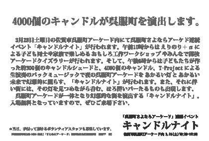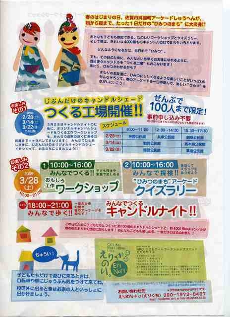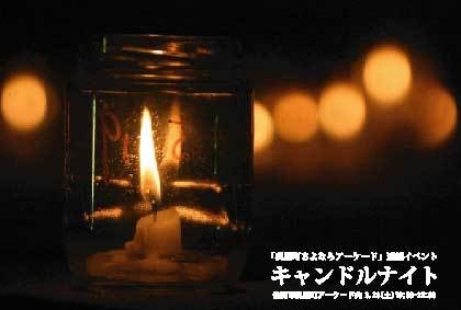 ☆☆4000個のキャンドルが呉服町を演出します☆☆ 3月28日土曜日、佐賀市呉服町アーケド内にて呉服町さよならアーケード連続イベント「キャンドルナイト」が行われます。 その中で午前10時からは、おもしろ工作ワークショップやみんなで探索アーケードクイズラリーが行われます。 午後6時からは4000個のキャンドル、ピアノの生演奏のバックミュージックで夜の呉服町アーケードをあかるい灯とあかるいみらいで照らす「キャンドルナイト」が行われます。 また、それに伴い午後7時からは呉服町商店主催の「商店主と語