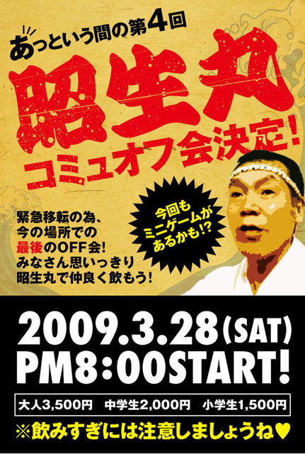 んと… 久しぶりのオフ会 そいがね… ここで重大発表します 実は… 今のお店… 立ち退きになります まだ常連さんも知りましぇん んで今のお店での最後のオフ会です 料金はじゃんけん大会込みで3500円 もちろん飲み食べ放題 小学生1500円 中学生2000円 じゃんけん後の参加は500円引き 遅れてきても早く帰っても食べなくても飲まなくても料金は一緒です みんなで雑魚寝できる