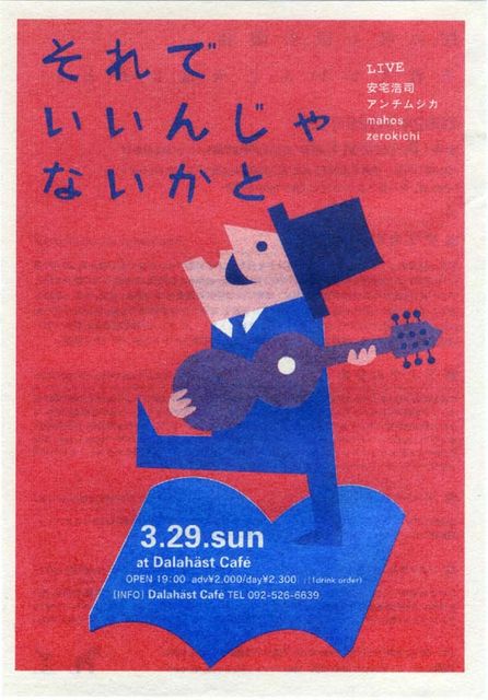 桜の咲く頃、安宅浩司やってきます。 それでいいんじゃないかと、3回目です。 今回はダーラヘストカフェへお邪魔します。 年度末、忙しい時ですが、どうぞお待ちしております。 3/29 会場|Dalahast Cafe(福岡・薬院) 時間|19:00開場 料金|予約2,000円/当日2,300円 ※共に別途1オーダー 演奏|安宅浩司/mahos/アンチムジカ/zerokichi 予約はDalahast Cafeまで TEL 092-526-6639 http://dalahastcafe.com/ ◎安宅浩司 http://www.kojiataka.com/ 2007年に1stアルバム「それでいいんじゃないかと」を発表。 ギター、ペダ
