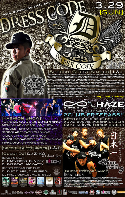 DRESS CODE presents "DRESS CODE" 2CLUB FREE PASS!! ∞INFINITY⇔HAZE FUKUOKA OPEN 22:00〜5:00 CLOSE ADV.2000YEN(1DRINK ORDER) DAY.2500YEN(1DRINK ORDER) 【FASHION SHOW】 DRESS CODE(MEN'S&LADY'S) MIDDLE TEMPO POPOLARE AQUA LIP MAKE UP,HAIR MAKE SHOW AND SECRET GUEST!! BABYSTAZent. 【DJ's】 BABY BOSS VIZZY FAT BEAT 【MC】 DAZZY RESTLESS MUSIC ent. 【DJ's】 DIRT FLARE KURIBO PROVIDENCE 【MC】 STEELO GRILLZ http://www.dresscode-style.com