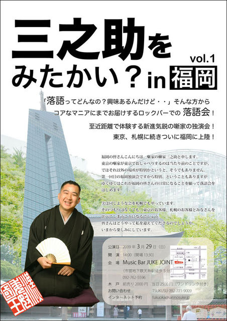 管理人さん、皆様、始めましてこんにちは〜 福岡でのキモノでお出かけを企画いたしましたので お邪魔させてくださいませ 「三之助をみたかい?in福岡 vol.1」 に一緒にキモノで行きませんか?を企画します 公演日:2009年3月29日(日) 開 演:14:00 (開場 13:30) 会 場:Music Bar JUKE JOINT 市営地下鉄天神駅 徒歩5分 木 戸:前売り 2000円 当日2500円 (ワンドリンク付き) 会場のキャパが40名だそうです。 詳細はこちら・・・ http://www.sannosuke.jp/2009/02/17/in_vol1.html