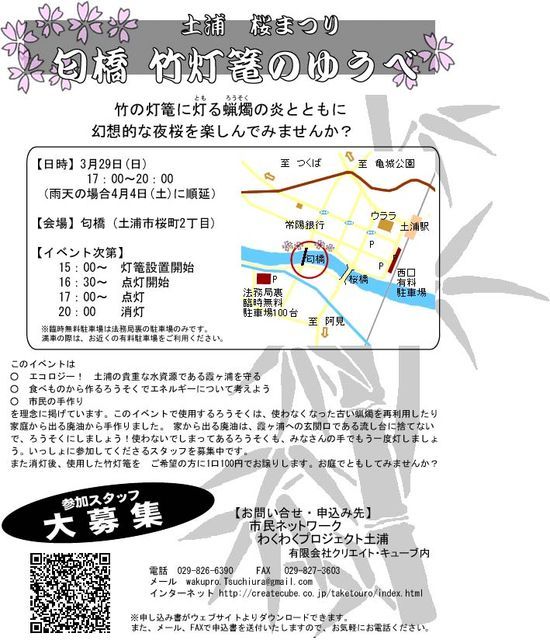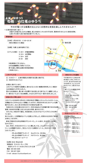 以前このコミュでご紹介した、mixi発の土浦市における地元活性化イベント「キャンドルナイト」の第二弾です。 東京から軽く日帰りできる土浦市。実は桜の名所がたくさんあります! 平成21年3月20日(祝)〜4月12日(日)の期間中、「桜祭り」としてさまざまな市内観光イベントがあります。今年の桜前線の予報を見る限りとてもいい季節になりそうです。 ***画像はこんな感じ 〈土浦市のホームページより〉 http://www.city.tsuchiura.lg.jp/index.php?code=1101 〈土浦市観光協会〉 http://tutiura.727.net/sakuramaturi/index.html