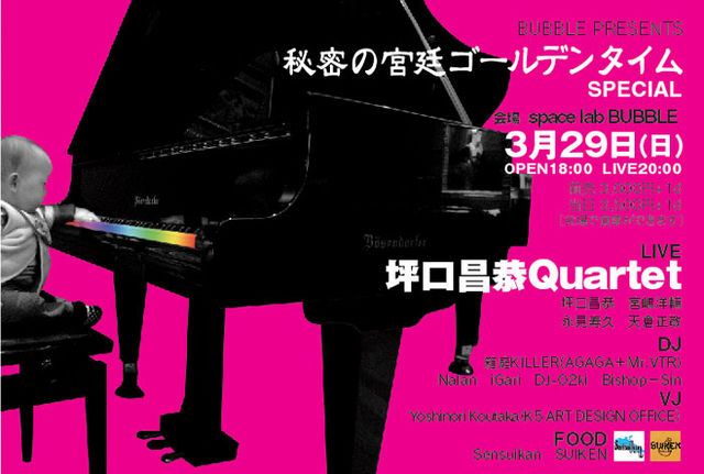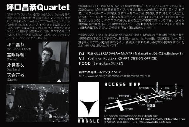 イベント告知失礼致します。 『坪口昌恭Quartet』 が水戸でLIVEです!!!! 水戸では初となる演奏を是非ご覧下さい。 BUBBLE PRESENTS 秘密の宮廷ゴールデンタイム SPECIAL!!!!!!!!(水戸市泉町) ---------------------------------------------------------------------------- 今回はBUBBLE PRESENTSとして秘密の宮廷ゴールデンタイムスペシャル『坪口昌恭Quartet』の特別宮廷晩餐ライブ。 今までと異なった斬新な「JAZZ ライブ」を開催。 ライブ〜DJ〜フードの織りなすハーモニーが会場を創ります。 そして”JAZZ”というキーワードを