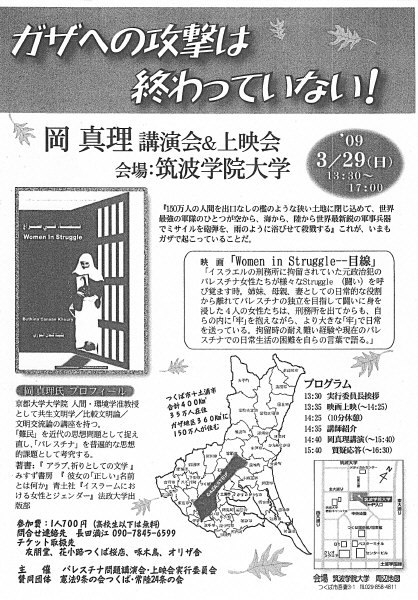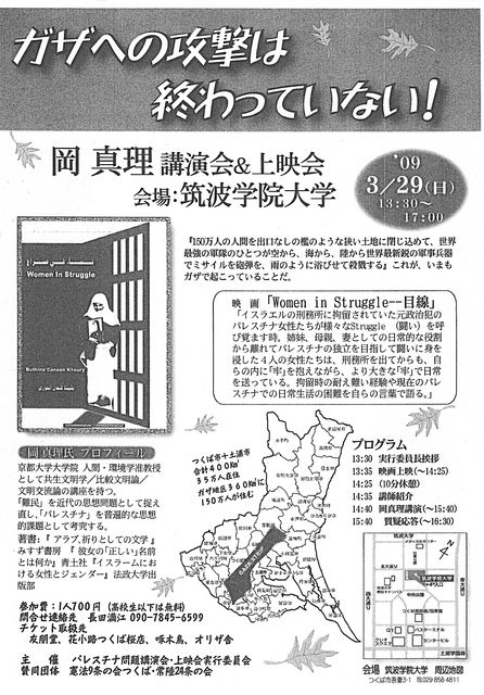 講師に岡真理さんをお呼びしてパレスチナ問題についての講演会・パレスチナ映画「Women in Struggle=目線」上映会を開催します。ぜひご参加下さい。 ●内容: 13:30〜14:30 パレスチナ映画「Women in Struggle=目線」 14:40〜15:50 岡真理さんの講演 「ガザへの攻撃は終わっていない」 16:00〜16:30 岡さんを囲んで・・・ 同時に今回のイスラエルのガザ侵攻を写した写真の展示を致します。 ◆交通:秋葉原からつくばエクスプレスで45分(快速)、終点つくば駅下車。徒歩5分。 ◆主催:パレスチナ問題講演