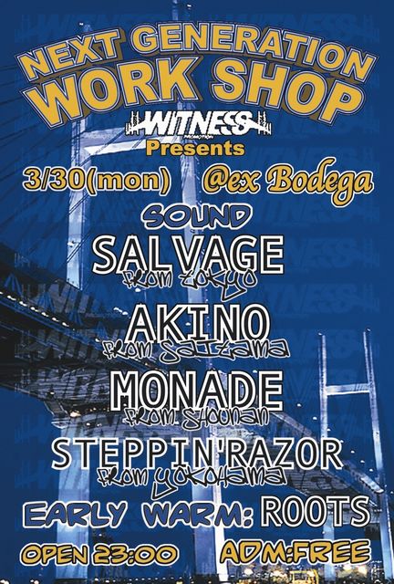 東京からBodega初見参SALVAGE。AKINOはジャマイカ帰りですよ!!湘南の次世代を担うMONADE。そして、Steppin'Razor!!