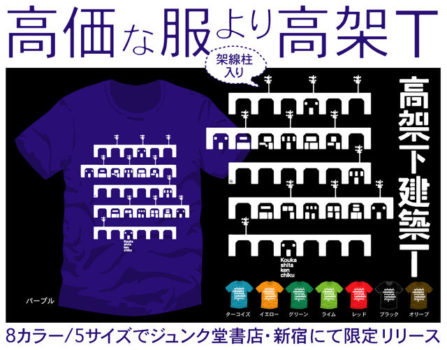 【高架下建築T】ジュンク堂書店・新宿店にてリリース開始! ---以下図案投票受付時の説明文です--- お好きなデザインに1票 アルファベッドひとつ ご投票いただけませんか? よろしくお願いします。 ボディとかプリントの色は(仮)です。 購入義務などございません お気軽に直感でコメントくださいませ。 A.某フィルムメーカー似、パーフォレーションが高架下に。 B.続々と空き高架にポツンと残る高架下くん、一人。 C.ヨーロッパっぽい?イメージのタイポと高架下ライン D.グラフィカルパターンで高架下、文字も無しで行きたいで