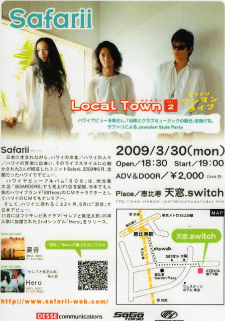vol.1が超満員&大盛況のうちに終わり 早くもvol.2の開催が決定しました 今回はなんとSafariiのワンマンライブです vol.1に来た方はもちろん 来られなかった方も どんどん参加しちゃってください みんなでvol.1以上にvol.2を盛り上げていきましょう 【詳細】 Safarii presents Local Town vol.2 公演日:2009.03.30 会場:恵比寿 天窓.switch 開場:18:30 開演:19:00 料金:\2000(Drink別) http://www.otonami.com/ebisu/news/
