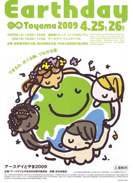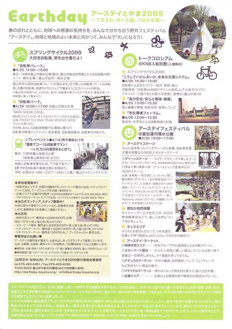 「アースデイとやま2009」 〜できるわ・めぐる輪・つながる環〜 春の訪れとともに地球への感謝の気持ちを みんなで分かち合う野外フェスティバル「アースデイ」 地球と地域のよい未来に向かってみんなで「わ」になろう! ・4月25日(土) 14:00〜19:00 26日(日) 10:00〜17:00 ・会場:富岩運河環水公園、富山市親水広場、KNB入船別館 ・入場無料・雨天結構! ◆アースデイステージ 天ぷら油を使ったバイオディーゼル発電・自転車発電・太陽光発電などの自然エネルギーステージ ◆グリーンステージ 〜コンサートやトー