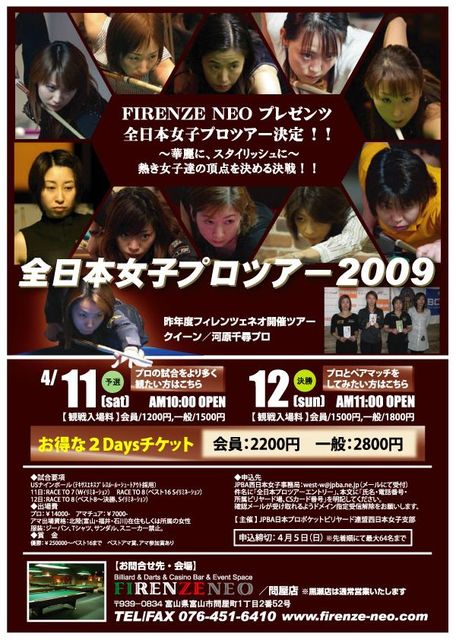 ◆1年に1度、華たちが舞う◆ 華やかな時が過ぎ、1年越しの待望の第2弾! FIRENZE NEO プレゼンツ ビリヤード全日本女子プロツアー開催決定!! +-+-+-+-+-+-+-+-+-+-+-+-+-+-+-+-+-+-+-+ 予選日: 平成21年4月11日(土) 開場/10:00 開始/10:30 決勝日: 平成21年4月12日(日) 開場/11:00 開始/11:30 +-+-+-+-+-+-+-+-+-+-+-+-+-+-+-+-+-+-+-+ あの有名なビリヤード女子プロ一同が、 FIRENZE NEOに再結成!華やか衣装に身を包み、 スタイリッシュに戦う熱き女子TOPプレイヤー達の、 試合は