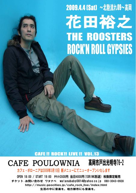 旅するロックンロールのジプシー、今年も春風にのって富山に〜流れ〜に来ます。 やっぱ、我らが兄貴、花田裕之ですよ。 ギブソン一本であの曲もあのブギーもやってもらいましょー。 CAFE!!ROCK!!LIVE VOL.15 花田裕之 ( ザ・ルースターズ、ロックンロールジプシーズ ) 高岡 〜流れ〜 2008年4月4日(土) Cafe POULOWNIA (旧 Cafe Love Supreme) 富山県高岡市戸出光明寺76-2 OPEN pm 18:30 START 19:30 チケット3500 円 当日4000円 (1DRINK別途。自由席と立