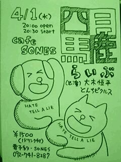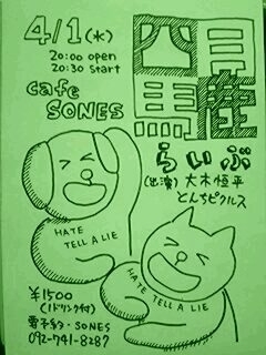 こんにちは、福岡を拠点にウクレレ演奏活動をしています、とんちピクルスです。こんど4/1にソネスでライブをします。共演は、同じく福岡でギターの弾き語りをしている大木恒平さん、深い森から響いてくるような素敵なギターを弾く方です。皆様是非お越しください!! 「四月馬鹿らいぶ」 [日時] 4/1(水) 20:00open 20:30start [場所] CAFE SONES 福岡市中央区薬院1-16-18 江島ビル102 Tel.092-741-8287 http://www.sones.cc/ [出演] 大木恒平、とんちピクルス [料金] 1500円(1ドリンク付) *要予約 092-741