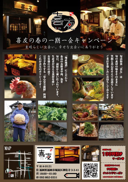 4月からの新しい企画を盛り込んだチラシが 明日仕上がって来ます!! 今回、うちのトータルプロデューサーが多忙のため 常連さんでずっとアドバイスを頂いていた フィールド ウェストのNさんにデザインをお願いしました。 なので、ちょっと今までとデザインを変えて貰ってます。 1枚目が表で 2枚目が裏です だいぶデータを絞ってもらったんで拡大すると すこし荒れてると思うんですが 表に料理や、店の外観、内観 取引農家さん