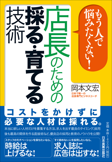 人の問題で悩みを抱える経営者・店長・小さな組織員のマネジャーの方必見!! 4月2日午後2時30分から、 『もう人で悩みたくない!店長のための採る・育てる技術』の著者・岡本文宏が 出版記念セミナーを開催します。 今回のセミナーでは現場で自ら「考え・動く」スタッフを 採用し、育成していくための方法をご紹介します。 特に、出版された本では編集の都合で、 ご紹介できなかったエピソードも踏まえ より深掘りしたコンテンツをご用意いたしました。 尚、このセミナーに無料でご参加できる方法を 以下のURLのページに記載
