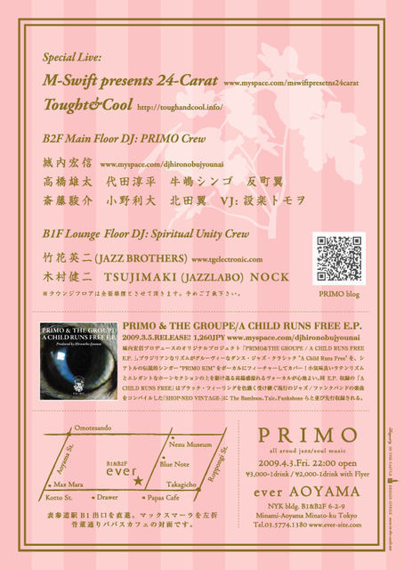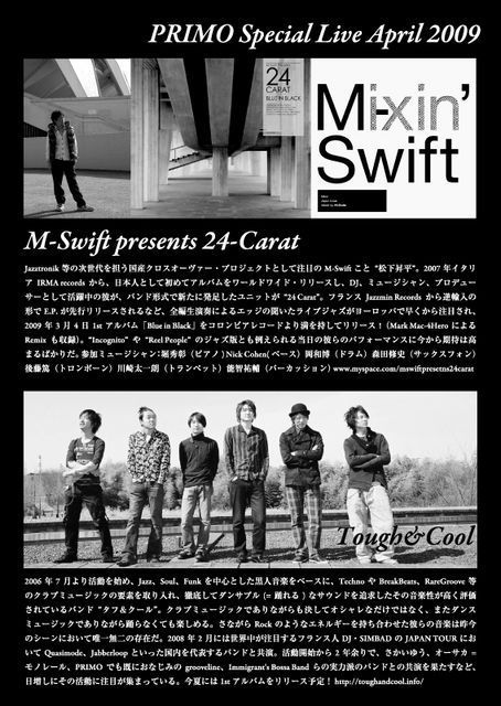 *コメント覧に出演者のインタビューやチャートの紹介、 そして当日のディスカウント情報等も掲載しておりますので、 本文の情報と合わせて、是非ご活用ください。 2005年に始まったジャズイベント「PRIMO」も今年5月で4周年間近を迎えます。 2009年初回は、2009.4.3の開催です。ライブには新進気鋭のアーティスト、 「M-Swift presents 24-Carat」と「Tought&Cool」の2組を招待致しました。 さらにラウンジでは竹花英二(JAZZ BROTHERS)氏を筆頭に SPIRITUAL UNITY CREW が華を添えます。 PRIMO CREWにも新メンバーが加わり、4周年
