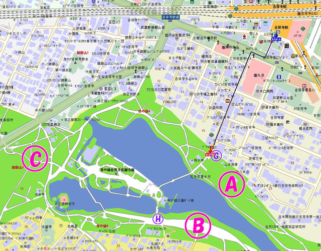 毎年恒例、井の頭公園で、お花見します! ■1次会 日時:4月3日(金曜) 午前中から午後まで。いつ来てもOK(ただ会費は一律になっちゃう、ごめん) 会費:1000円だとおもう! 差し入れ等:適当に持ってきてくれても嬉しい♪ 持ってこなくても勿論OK! 場所:井の頭公園 (吉祥寺駅南口(井の頭公園口)より、南へ徒歩5分程度) ※公園内のA地点あたりでやる予定(場所が取れなければ、BかC) G地点までは自力で来てください。そこで電話もらえれば迎えに行きます。 ※平日昼間ってことで、会社員の人は参加