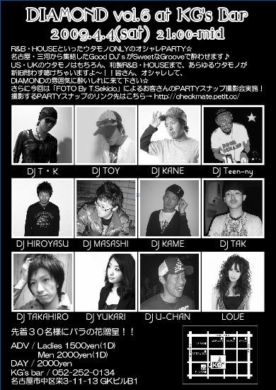 名古屋・三河から集結したGood DJ'sが、US・UKのウタモノはもちろん、最近話題の和製R&B・HOUSEまで、新旧問わず間違いない選曲で酔わせます