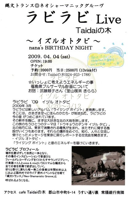 2009/4/4(SAT) ☆PLATINUM☆ @NEO(福島) OPEN 21:00 ADV :2500(1D) DOOR:3000(1D) SP.GUEST DJ RYOW(名古屋) DJ 034 SATT HIROM.Jr ANTI THE 紅ノ一 プリメラ LIVE CRASH BOMB STARZ TRIP HOOD CROWN RECORDS 男(仙台) MASTER-DEF(秋田) NICKY LUCIANO(郡山) NINJA(郡山) 烈火(白河) DAZU-O(いわき) LBD(会津) 我次郎MIC(群馬) FM CLASS DJ BIG-J ROKIE MOSE(秋田) ZEEYA K-2 TO2 RAPTURE SINGER SISTA AKI SHIMVA DANCER レトロ サエとモキ FIO HOST MC 036
