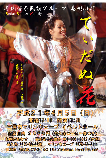 告知、失礼いたします。 喜納啓子民謡グループLIVE 『てぃだぬ花』 4月5日(日)、三豊市マリンウェーブ・イベントホールにて開催です。 沖縄民謡の重鎮・喜納昌永(きなしょうえい)さんの娘であり、 “花”や“ハイサイおじさん”などの作者で、 国際的な音楽家・喜納昌吉(きなしょうきち)さんの妹、 喜納啓子(きなけいこ)さんが三豊市にやってきます。 息子・エディ、孫娘・昌代、ステファニーと共に結成した 『喜納啓子民謡グループ』の活動は沖縄だけにとどまらず、 これまで全国各地でライブを行ってこられ