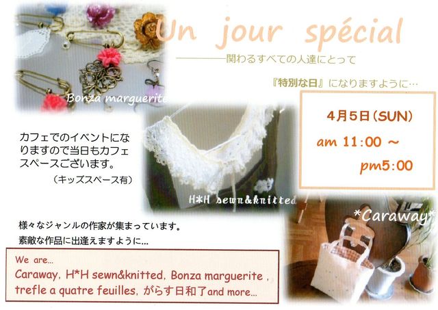 4月5日(日) 通常は、日曜日は店休日ですがその休日を利用して 初の試み handmade雑貨の1dayショップをやります 時間は 【11:00〜17:00】 お店の半分のスペースを使ってやります♪ もう半分はいつもとは違ってその日限りの特別メニューでカフェスペースもオープンします ランチ[限定10食]…800円(ドリンク,デザートは各プラス100円) ドリンク各種…400円(一部500円) デザートセット…ドリンク+各100円 ※デザートは数種類から