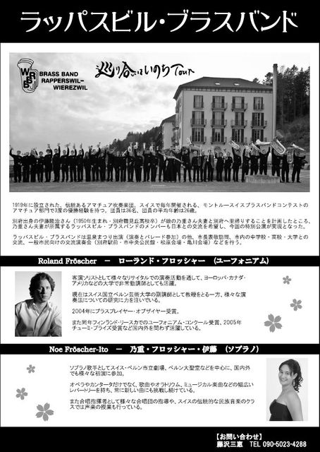 管理人様、告知失礼致します。 ▼ 明日からいよいよ「平成21年度 別府八湯温泉まつり」が開催されます その最終日の4月5日(日)に、「別府八湯音泉めぐり」と題した音楽イベントがあり、 ラッパスビル・ブラスバンドというスイスのブラスバンドの公演が行われます。 ラッパスビルの公演は、別府中央公民館・松原会場・別府駅前・亀川会場で行われるのですが、 亀川公演だけ後に決まったため、一切広告やパブリシティには記載されていません 亀川公演の広報をさせていただきます 以下詳細です。 ---