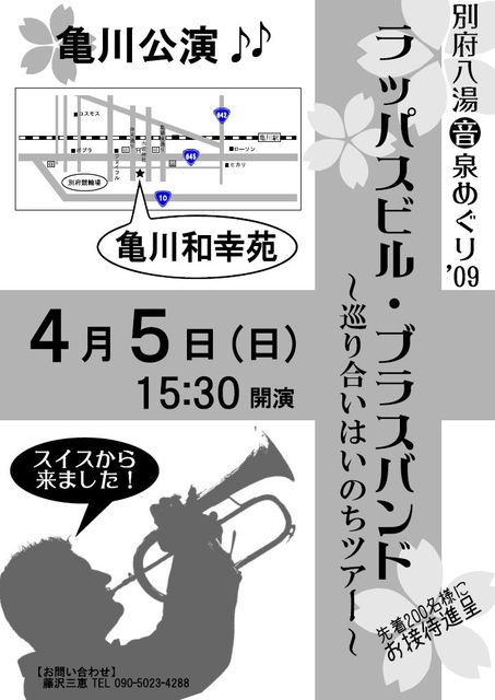 明日からいよいよ「平成21年度 別府八湯温泉まつり」が開催されます その最終日の4月5日(日)に、「別府八湯音泉めぐり」と題した音楽イベントがあり、 ラッパスビル・ブラスバンドというスイスのブラスバンドの公演が行われます。 ラッパスビルの公演は、別府中央公民館・松原会場・別府駅前・亀川会場で行われるのですが、 亀川公演だけ後に決まったため、一切広告やパブリシティには記載されていません 亀川でもやります 以下詳細です。 ----------------------------------------------------------