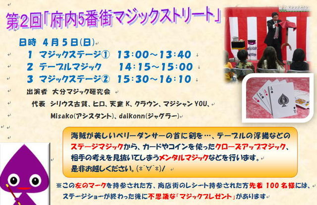 第2回府内5番街マジックストリート 大分マジック研究会 Oita Magician's Brotherhood 通称 大分マジブラ(魔法使い仲間) を主催しています シリウスです。 第2回府内5番街マジックストリートを 2009年4月5日(日)に開催します。 詳しくは下記を http://mixi.jp/view_event.pl?id=39919856&comm_id=1989910 ストリート仮説ステージなので入場無料です。 チラシを印刷してお持ちいただけばお土産マジック進呈 場所:府内五番街からくり時計付近 マジックステージ?13:00〜13:40 テーブルマジック 14: