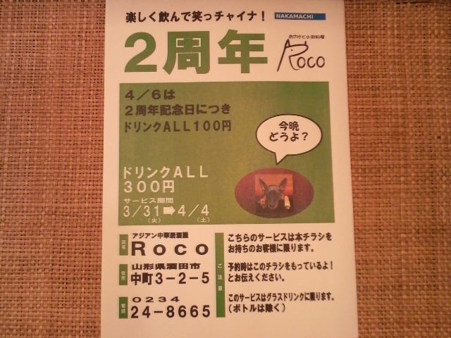 あっというまで「Roco」は4月6日で2年を迎えることになるました。 今年は感謝の気持ちからドリンクを格安で提供させて下さい 4月6日(月)メニュー内ドリンク(250円〜750円)→ALL100円 3月31日(火)〜4月4日(土)上記と同じく →ALL300円 ただいま、ご来店のお客様にチラシを配布中 チラシご持参が原則ですが、 いつもRocoを気にかけてくださるメンバーの皆様だけ チラシなくても前日のご予約でなので ご予約の際、ココを見ました