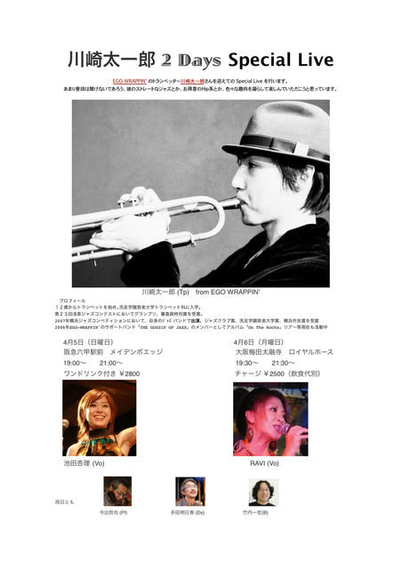 ●大阪 梅田【ロイヤルホース】 4月06日(月曜日)19:30 21:30 チャージ ¥2500(飲食代別) 川崎太一朗 (Tp) / 今出哲也 (Pf) 竹内一宏(B) / 多田明日香 (Ds) RAVI (Vo) 大阪市北区兎我野町15-13 ミユキビル1階 TEL:06-6312-8958・9 http://www.royal-horse.jp