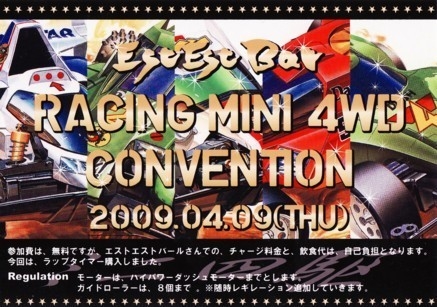 みなさんこんにちは、楽チンでございます 第2回大人のミニ四駆大会開催いたします 平成21年4月9日(木)21:00頃から 参加費は、無料ですが、エストエストバールさんでの、チャージ料金と、飲食代は、自己負担となります 今回は、ラップタイマー購入しました TA−3さんから、コースの寄付ありました レギレーション決定 モーターは、ハイパワーダッシュモーターまでとします ガイドローラーは、8個まで ※随時レギレーショ
