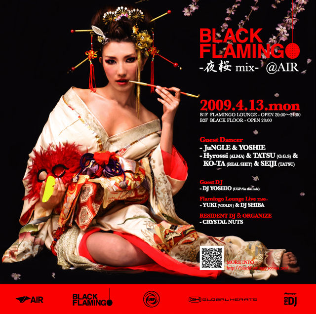 管理人様 貴重な告知スペースありがとうございます。 平日の代官山AIRを彩る華やかなパーティーです♪ ゲストダンサーも、ヤバイ。。。ので、是非、遊びにきてください♪ RABBYまでご連絡頂ければ、ゲストおとりします♪ □ 代官山AIR HOUSE DANCERS PARTYのパイオニア 平日なのに平日じゃない.... それが BLACK FLAMINGO □ http://blackflamingo.seesaa.net/ こちらからスライドショーなどを使った ヴォリュームあるパーティ詳細などを見ることが出来ます。 CHECK IT!! 2009.4/13 Monday @A