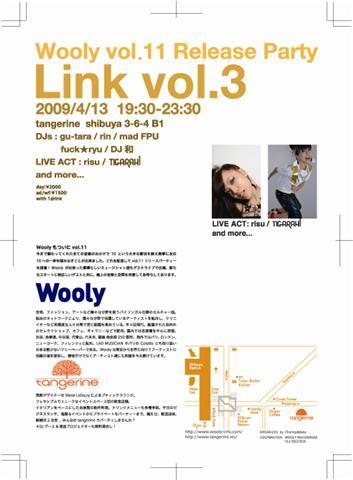 管理人さま告知失礼します。 4/13(MON) Wooly Vol.11 Release Party @ tangerine shibuya 3-6-4 B1 Djs: gu-tara / rin / mad FPU / fuck★ryu / DJ和 Live Act: risu / TIGARAH! OPEN:19:30 CLOSE:23:30 DOOR \2000 AD/WF \1500 with 1drink MUSIC:J-POPを始め、クラブが初めての人でも楽しみやすい内容となっております。またTIGARAH!、risuのバンド演奏があります、お楽しみに!! About Wooly 音楽、ファッション、アートなど様々な分野を扱うバイリンガル仕様のカルチャー誌。 独自のネットワークにより、様々