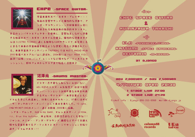 管理人様、告知失礼致します。 EXPE SPACE GUITAR & 沼澤尚 2 STAGE SPECIAL LIVE 4/14(tue)@Django -LIVE- EXPE SPACE GUITAR & 沼澤尚 DRUMS -DJ- EIJI (PSYCHEDELICIOUS) KATSUMI (SPACE GATHERING) KEITAMIN (m-cosmo) adv 2,000yen day 2,500yen open 20:30 1 STAGE LIVE 22:00 2 STAGE LIVE 24:20 ☆ EXPE SPACE GUITAR ☆ 宇宙未来形スペースギタープレイヤー!! 独自の音響サウンドと個性的な演奏で、アンダーグラウンドシーンや好事家から常に注目される大阪出身の独創的ギタリスト。