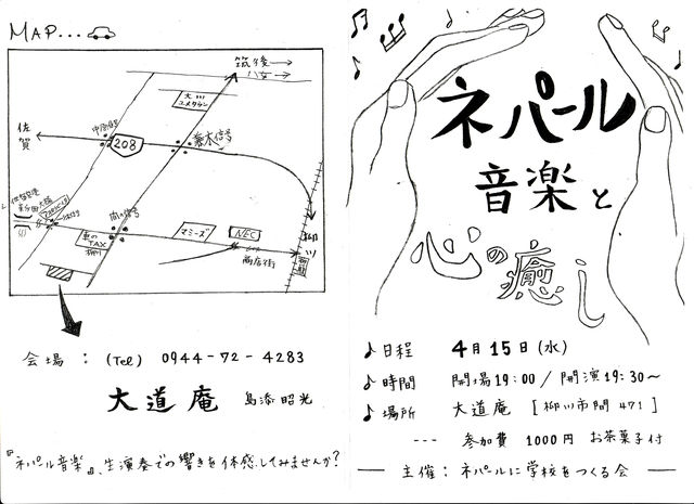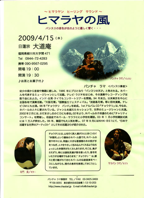 柳川市間にあるお寺で、ネパール音楽のコンサートがあります。 私がいろいろとお世話になっているご住職のお寺です。 出演されるのは、バンスリ奏者のパンチャ・ラマさん。 ネパールの音楽を聴く機会って滅多にないと思います。 よかったらお気軽にお越しください。 【ネパール 音楽と心の癒し】 日 程 4月15日(水) 開 場 19:oo〜 開 演 19:3o〜 場 所 大道庵(柳川市間471) 参加費 1,ooo円(お茶とお菓子付き) お問い合わせ 0944-72-4283(島添) パンチャ・ラマ <バンスリ奏者> 幼少の頃から音楽や舞踏に親し