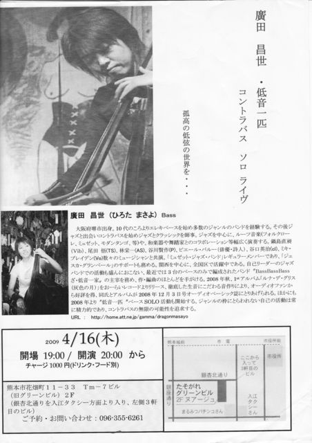コミュニティのみなさまこんにちは。 あたたかい日がつづいていますね。 熊本にあるヌアージュというお店で 廣田昌世ベースソロライブを行います 近郊の皆さんぜひライヴに来てくださいね みなさまのお越しをお待ちしております ------------------------------------------------ 4/16(木) ヌアージュ・熊本 熊本市花畑町11−33 Tm−7ビル(旧グリーンビル)2F (銀杏北通りを入江タクシー方面より入り、左側3軒目のビル) TEL:355-6261 http://www2.infobears.ne.jp/athome/hp01aa/nuages.htm 20: