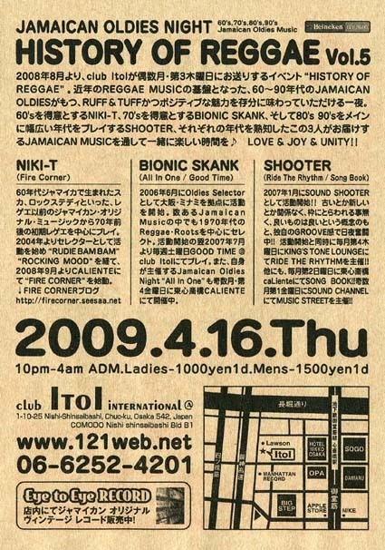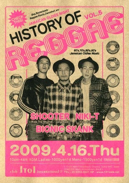 2008年8月より、club ItoIが偶数月・第3木曜日にお送りするイベント“HISTORY OF REGGAE”。近年のREGGAE MUSICの基盤となった、60〜80年代のJAMAICAN OLDIESがもつ、RUFF & TUFFかつポジティブな魅力を存分に味わっていただける一夜。60'sを得意とするNIKI-T、70'sを得意とするBIONIC SKANK、そして80's 90'sをメインに幅広い年代をプレイするSHOOTER、それぞれの年代を熟知したこの3人がお届けするJAMAICAN MUSICを通して一緒に楽しい時間を♪